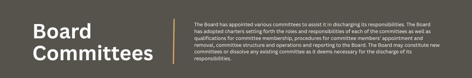 The Board has appointed various committees to assist it in discharging its responsibilities. The Board has adopted charters setting forth the roles and responsibilities of each of the committees as well as qualifications for committee membership, procedures for committee members' appointment and removal, committee structure and operations and reporting to the Board. The Board may constitute new committees or dissolve any existing committee as it deems necessary for the discharge of its responsibilities.